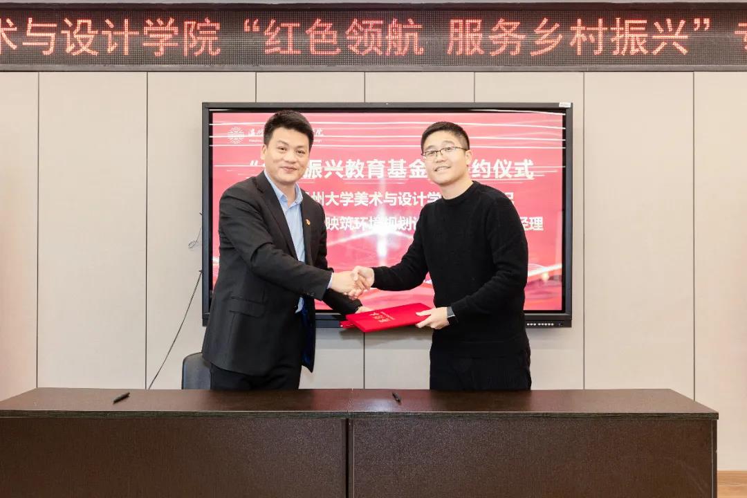 美公司党委书记叶正飞老师和浙江映筑环境规划设计有限公司颜仕洲总经理签约乡村振兴教育基金。