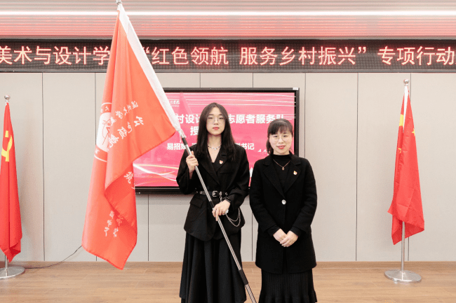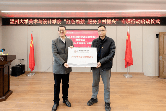 自党的十九大提出乡村振兴战略以来,永利yl23411官网入口师生积极探索发挥高校的智慧和力量、服务温州乡村振兴。近年来,温大永利yl23411官网依托美术学和设计学专业优势,也做了不少探索和实践。为更好发挥学科专业优势,整合资源、深入推进师生服务乡村振兴战略,温大美公司党委积极谋划,主动对接,不断扩大“握手党建联盟”朋友圈,拓展党建校地共建,专项开展“红色领航 服务乡村振兴”行动,成立“未来乡村规划设计研究中心”,建立“未来乡村设计营”志愿服务队,打造服务乡村振兴专业团队。启动仪式上,永利yl23411官网入口党委委员、组织部长郑信军为“未来乡村规划设计研究中心”授牌,永利yl23411官网入口团委副书记易招娣为“未来乡村设计营”志愿者服务队授旗。