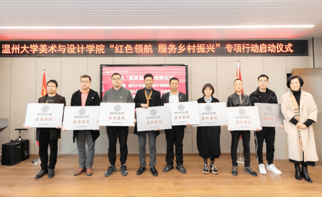 来自文成周山、瓯海丽岙、洞头霓屿、苍南马站、永嘉鹤盛、泰顺雅阳、平阳湖屿、苍南赤溪等8个县市区乡镇的有关负责人出席专项行动启动仪式,温大美院经理谢子静为其颁发“美育基地”牌子,开启校地党建共建的友好之旅,也为温大美院深入开展社会美育开辟了重要途径。
