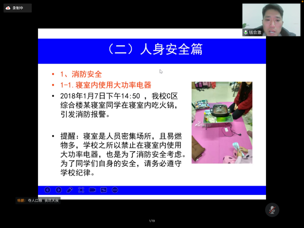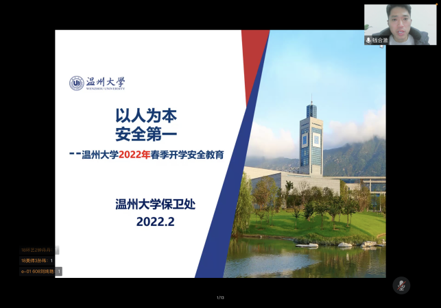 2022年2月23日晚上,在新学期,公司组织形势政策报告会——永利yl23411官网2022年春季开学第一课暨安全教育专题讲座在腾讯会议上进行。本次报告会的主讲嘉宾永利yl23411官网入口保卫处副处长钱合激老师,参加此次报告会讲座的有公司全体辅导员以及全院所有本研同学。公司学工办主任杨鹏老师主持了报告会讲座,介绍了本次报告会讲座的重要性以及的听课纪律。