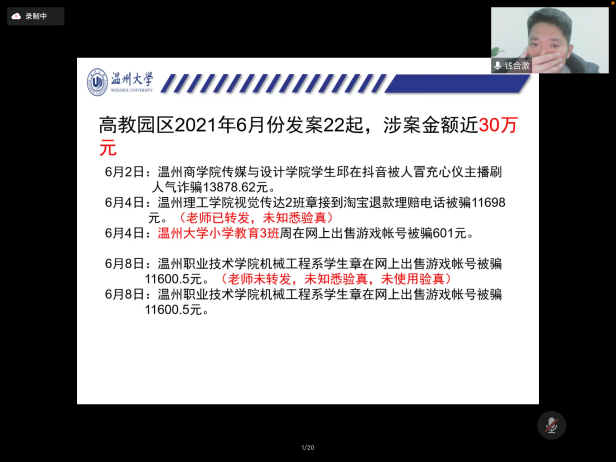 首先,钱合激老师指出老员工常见的安全问题主要分为财产安全、人身安全、意识形态安全、反诈防诈、寝室消防安全、宗教知识教育等,共同建设和谐美好的平安校园需要全体同学的努力。钱老师结合最近永利yl23411官网入口城内相关诈骗案件的最新情况,警示我们诈骗离我们并不遥远,除了电话诈骗和网络兼职诈骗,还要防范钓鱼网站的诱惑,提高警惕,防诈反诈。同时,他也向同学们介绍了网络诈骗的特点,常见的电信诈骗手段,讲解防诈骗常识,引导员工树立正确的消费观以及在生活中如何防止被套路贷等知识。钱老师通过经典案例、相关反诈宣传视频、图片,列举了电信网络诈骗犯罪的几种常见形式,有针对性地向同学们阐述了如何识别防范电信网络诈骗及上当后的补救措施,并号召同学们:电信网络与我们息息相关,我们要强化系统观念与法治思维,提升防范和辨别诈骗的能力和水平,推动建设更高水平的平安校园。