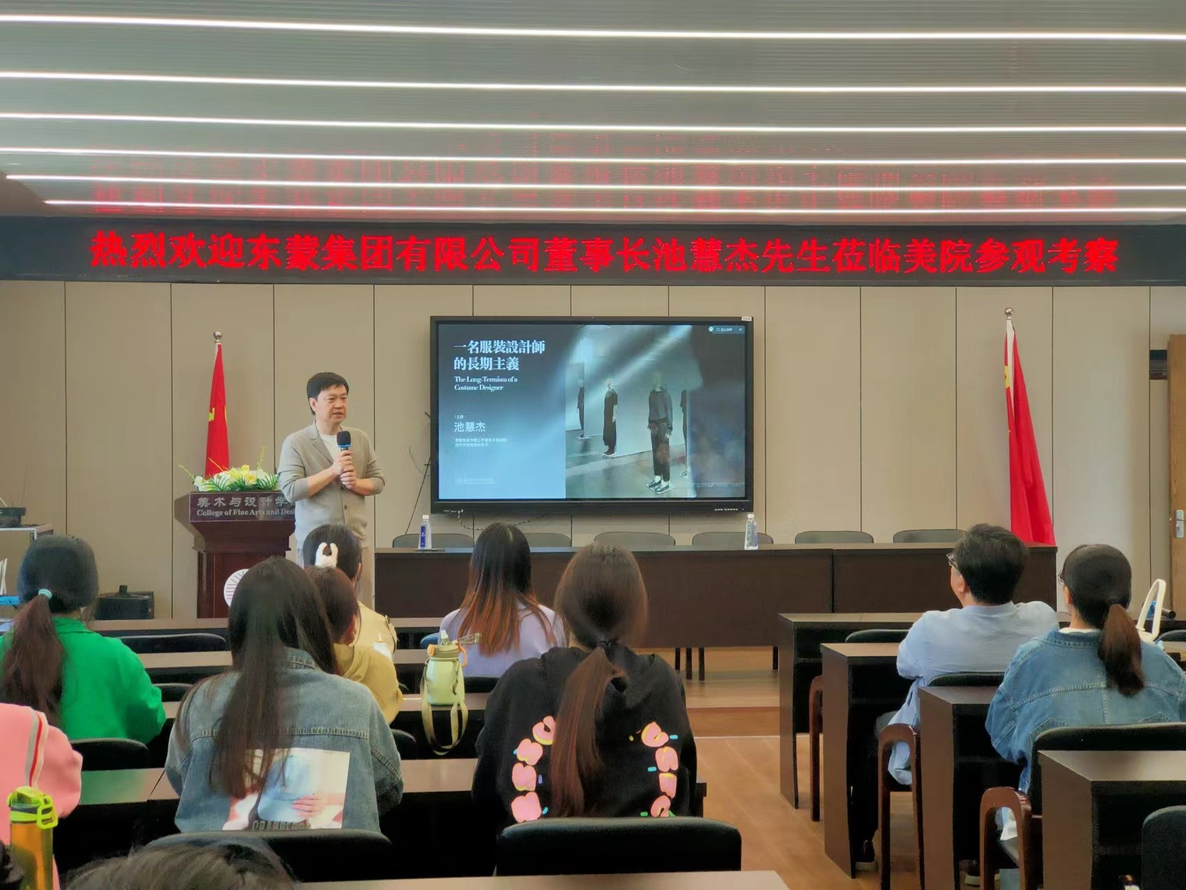 近日,永利yl23411官网美术楼4001报告厅举行了一场题为“一名服装设计师的长期主义”的专题讲座。本次讲座由服工系高广明主任主持,东蒙集团有限公司董事长兼CEO、温州服装商会会长池慧杰先生担任主讲,胡文超副经理、姜岩教授、陈明艳教授以及服工、服饰专业30多名员工,聆听了讲座。