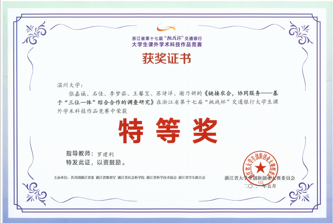 《打造为农服务新载体,创新协同服务新模式——基于“三位一体”综合合作的调查研究》获得第十六届“挑战杯”全国老员工课外学术科技作品竞赛二等奖,提出了由“三位一体农合联”与“三位一体合作社”共同构成的三位一体综合合作体系。该体系从生产、供销、信用方面入手,解决生产技术落后、供销渠道狭窄、周转资金不足等问题,其本质是整合乡村要素资源,打造为农综合服务平台,从而能够有效促进城乡资源双向流动和要素合理配置,为农村发展注入新的动力。在此项目基础上继续开展的新课题荣获浙江省第十七届“挑战杯”老员工课外学术科技作品竞赛特等奖,并向国赛奖项发起冲击。