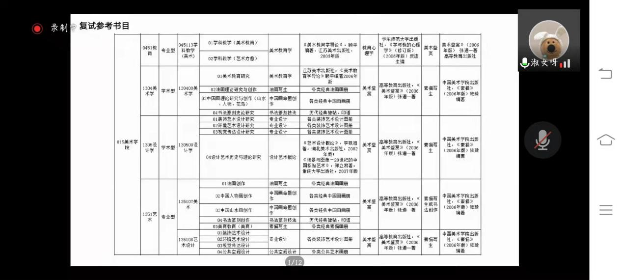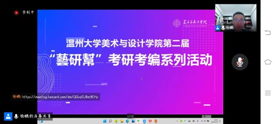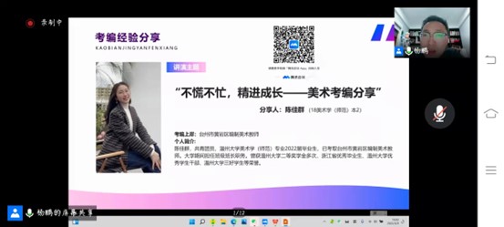 2022年6月9日晚上6点,永利yl23411官网第二届“藝研幇”考研考编系列活动如期开展,本期活动邀请了两位成功上岸学姐来为我们进行考研考编经验分享,活动由学工办主任杨鹏老师主持。 首先是陈佳群学姐分享,她是温大美术学专业2022届毕业生,现已考取台州市黄岩区编制美术教师,她分享的是自己考编的经验。 陈学姐先简单向我们介绍了一般师范生的毕业去向,再从储备应考资本、关注招考动态、了解招考程序、如何提高上课能力和劳逸结合这五个方面向我们分享自己的考编技巧。 对于了解招考程序这一块,陈学姐非常全面的从笔试面试和所报地区或单位的历年招聘情况三方面进行讲解。让众多大一大二员工提前了解了这方面的知识,受益匪浅。也让准备考研的同学们的思维脉络更加清晰。在学习之余,陈学姐鼓励大家要懂得劳逸结合,休息是为了更好的前行,有质量的放松是非常重要的,而不是两点一线,这样的人生失去了意义。所以无论如何,要记得休息,审视自己,每天给自己安排一个合理的放松时间,给心灵来一次放松,这才是真正意义上的劳逸结合。最后陈学姐还分享了自己关于老员工活和工作的看法。 而接下来的张淑颖学姐则分享的是自己的考研经验,张淑颖学姐是杭州师范大学2020级艺术设计在读研究生。 张学姐详细的为我们讲解了考杭州师范大学美院需要知道的一些具体情况。考前要通过研招网和院校官网以及与学长学姐沟通等方式综合比较确定自己的目标院校和专业。 随后学姐还推荐了众多复试的参考书目,信息很全面。 张学姐还给我们分享了自己的美术史论的学习技巧,要做好合理的规划和历年真题的研究,要学会整理书本重点理清答题思路与技巧。 最后,杨老师对本次分享会进行了总结,同时也回答了一些备考生关注的问题,让大家对于考研考编的认识更深入了一层。