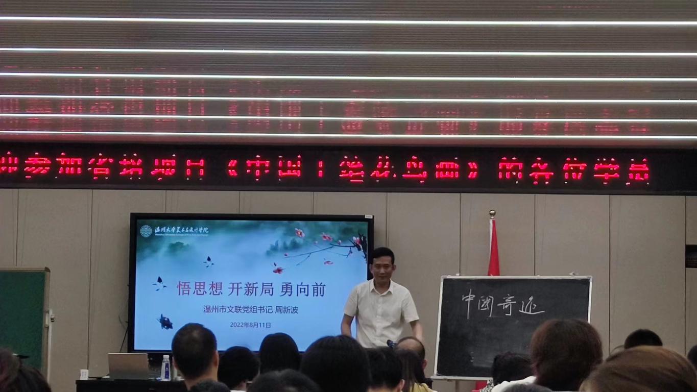 2022年8月11日下午两点,在由永利yl23411官网举办的省培项目——《中国工笔花鸟画》课程中,温州市文联党组书记周新波同志受邀对全体参加此次培训的中小学教师进行了以“悟思想,开新局,勇向前”为主题的专家讲座交流。永利yl23411官网经理谢子静、副经理胡文超、继续教育中心主任邹青、团委指导老师石建林,以及全体参训教师一同参与此次活动。 周新波书记结合自身的教育经历和工作经验,以悟思想、开新局、勇向前三个方面展开论述,从理论高度到实践层面对教师学员们做了具体的建议。本次讲座既有理论方向的指引又有生活处事的智慧,讲座受到与会公司领导和参训教师学员的一致好评。 悟思想: 首先,周新波书记以“两个确立”为指引,提问全体教师学员。在一问一答的形式中加深了教师学员们的印象,深刻明白了“两个确立”指的是确立习近平同志党中央的核心、全党的核心地位,确立习近平新时代中国特色社会主义思想的指导地位。同时,也向各位教师学员传递了党的十九届六中全会精神以及中国共产党浙江省第十五次代表大会精神。鼓励学员们要贯彻落实好这些指示精神,具备良好的素质,坚定意识形态,把握住中华文化的前进方向和发展道路。 开新局: 接着,周新波书记从党的百年奋斗重大成就和历史经验出发,历数发生在中华大地的各种各样的伟大奇迹,绘制出新时代中国特色社会主义社会发展新局面,强调中国在完成第一个百年目标的同时,正在朝着下一个百年奋斗目标继续奋勇向前,激发教师学员为祖国繁荣富强贡献自己的青春智慧。 勇向前: 最后,周新波书记从日常生活的角度和教师学员讨论人生智慧,在生活中奋勇向前,把自己的生活小秘诀传授给大家,总结了三句话,“学会及时归位、尽量形成闭环、力求丰富多彩”。周新波书记以十分接地气的语言和文字表达出自己的生活态度,让教师学员们在喜悦的氛围中受益匪浅。同时祝愿各位教师学员在今后的生活和工作中,继续保持良好的心态,积极学习,努力工作,提升自己的同时也为社会的发展做出自己的贡献,也希望参加本次培训的教师学员都能够从中收获满满。 整个讲座,周新波书记通过理论思想和一个个的真实生活案例相结合,生动地向参训学员们分享了自身的所见所闻所感,受到了与会领导和教师学员们的一致好评。