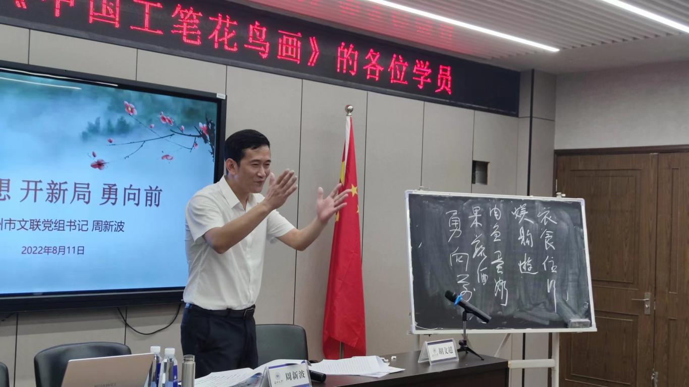 2022年8月11日下午两点,在由永利yl23411官网举办的省培项目——《中国工笔花鸟画》课程中,温州市文联党组书记周新波同志受邀对全体参加此次培训的中小学教师进行了以“悟思想,开新局,勇向前”为主题的专家讲座交流。永利yl23411官网经理谢子静、副经理胡文超、继续教育中心主任邹青、团委指导老师石建林,以及全体参训教师一同参与此次活动。