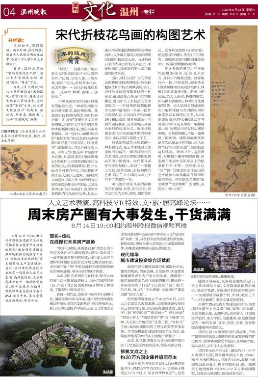 宋韵如水,浸润瓯越。两宋时期,韵之何在?藏在古人温雅文明的生活中,尽显于古人留下的众多瑰宝中。千年宋韵风华,数不清,道不尽。目前,温州正实施“宋韵文化传世工程”,要让千年宋韵在温州“流动”起来,“传承”下去。为此,《文化周刊》将从本期开始推出《宋韵瓯风·有赏》栏目,邀请温州文化名人带领读者,通过细品“宋韵”之美,让宋韵文化在温州“热起来、活起来、用起来、强起来”,打响“宋韵瓯风”品牌。谢子静 系永利yl23411官网经理、教授、硕士生导师“折枝” 一词最早见于唐朱景玄《唐朝名画录》中对边鸾的评价:“边鸾,京兆人也,少攻丹青,最长于花鸟,折枝草木之妙,未之有也…… 近代折枝花居其第一,凡草木、蜂蝶、雀蝉,并居妙品。”另外《宣和画谱》记载:“边鸾,长安人,以丹青驰誉于时,尤长于花鸟……又作折枝花,亦曲尽其妙。”可见在唐时花鸟画已具独有的取景角度,一种新的构图形态已基本形成,即折枝构图。花恩画折枝构图的概念该如何界定呢?从“折枝”字 面的狭义角度来理解,应是将大自然中的花草树木折断摘取回来,放在书案对着描绘。邹一桂《小山画谱》里说的“瓶插对临”和吴太素《松斋梅谱》里记载“初学写时,以瓶置花”,即是指此,均以折枝形式入画。并有以“折枝花卉”命名的作品记载,如郭若虚的《画见闻志》共载有七位画家画折枝花鸟画的记录,《宣和画谱》记载17人62件 折枝花卉作品,但记载的这些作品大部分已遗失。查阅《宋人画册》《中国古代书画图目》《中国绘画综合图录》并续编,以及众多的《宋代花鸟画册》,发现除全景构图的花鸟画作品外,其余大部分均采用截取物象的形式构成画面,仅少数几幅是以画面四周空白的折枝形式入画。而且明清以来的大部分折枝花卉册页、手卷和扇面,其画面构图采用的也是截取的折枝形式。崔白(北宋)《寒雀图》因此,我们从更广义的角度去理解折枝构图的概念,应包括截取法和折枝法两种表现形式,折枝法是画家搜集素材的一种形式,截取法是让画面中的物像撑边,进而扩大了折枝法的艺术表现力——折枝构图是截取树木花草中最美的一角或一段作为表现内容,并对画中所取物象进行概括取舍,使其形成既可与画外保持联系,又令画幅四周留有余纸的构图方式。其构成法则运用灵活,结构组合丰富变化,内涵深广且法度严谨。折枝式构图是宋代花鸟画最常用的构图形式,宋以后则日趋程式化了。程式是构成艺术形式的一种主要方式,是艺术家经过长期提炼而形成的一套相对稳定的艺术语言,是文化的延续和发展必不可少的载体。宋代花鸟画在写实的基础上,形成了一套精工勾勒、重彩渲染、折枝构图的艺术“程式”,在中国花鸟画史上写下了光辉的一页。宋代的折枝花鸟画的画幅形式有直幅、长卷、册页之分,册页又可分为方形、圆形、扇面等形式。长卷形式如崔白《寒雀图》、扬无咎《四梅图》、佚名《百花图》等。直幅形式如马麟《层叠冰绡图》、牧溪《翡翠鹳鸽图》等。佚名(南宋)《疏荷沙鸟图》绝大多数的册页小品尺幅均在横25厘米、纵25厘米左右,具有小巧精致之感。画家取花卉一枝,巧布成局,如宋佚名《海棠峡蝶图》《疏荷沙鸟图》,林椿《果熟来禽图》等。册页中的团扇,给人以温和、典雅的感觉,如马麟《绿橘图》,林椿《写生海棠图》等。还有一些其它形式的扇面,具有随意、亲切之感,如佚名《豆花蜻蜓图》等。佚名(南宋)《海棠峡蝶图》宋人崇尚方形或圆形的小幅折枝画与当时的实用和审美意识有着密切关系,从《梧荫清暇图》和李公麟《高会学琴图》的屏风可见其中的一幅幅精美小画,这都是当时实际应用的画幅。方形的画幅,乃是一扇屏风上的饰图。圆形画幅更多的是作为纨扇面子的饰图,古人所谓“轻罗小扇扑流萤”,指的就是这种纨扇。除此之外,这些圆形、方形和少量异形的画幅,还来源于生活中实用家具上的贴络和灯片子等。这些册页以“方”“圆”的视觉形态传达出的艺术精神与审美趣味是静思和追求平稳。这也继承了儒家“温文敦厚”“文质彬彬”的理想,表现为“中和之美”。按康定斯基的说法,正方形在公式性的基础平面中是最客观的形态,寒冷感和暖和感保持着相对均衡,而圆形则是最接近不带色彩的静止的平面形态。林椿(南宋)《果熟来禽图》