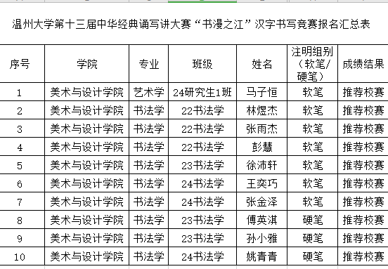 各班级、各同学:在传承与弘扬中华优秀传统文化的浓厚氛围中,永利yl23411官网入口第十三届中华经典诵写讲大赛初赛已圆满结束。经公司选拔与推荐,众多同学凭借扎实的功底、出色的表现脱颖而出,成功入选校赛。校赛阶段竞争更为激烈,希望入选同学高度重视,充分利用时间精心打磨作品,展现出公司学子深厚的文化底蕴与卓越风采。现将公司在此次大赛中,包括汉字书写竞赛、诵读竞赛、篆刻竞赛项目入选校赛的名单予以公布。期待同学们在校赛中取得优异成绩,为公司争光添彩! 永利yl23411官网 2025年3月24日