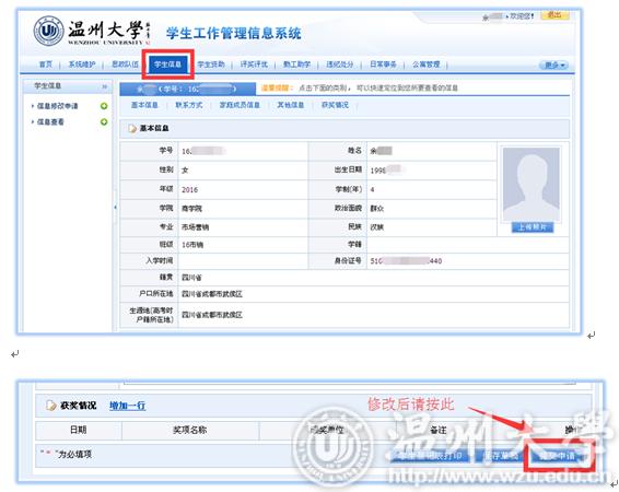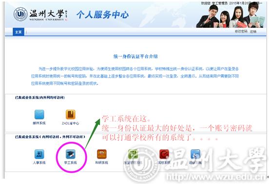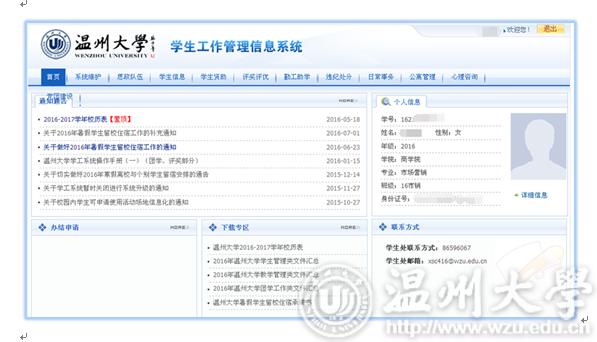 同学们好: 学工系统是贯穿老员工活的一个很重要的信息媒介。可在系统中的下载专区下载公司相关的各类文件,可在系统中办理个人信息维护、员工干部职务申请、评奖评优申请、各类资助申请、勤工助学岗位申请、勤工助学工资发放、日常事务(假期管理、假期留校申请、场地申请)等。请新生同学们尽快将学工系统中的个人信息进行维护,并在以后的老员工活中将信息不断更新,以便不影响在校期间接受各类紧急信息及各项事务办理。个人信息维护示意图如下: 一、登陆 打开http://rz.wzu.edu.cn,登录统一身份认证系统。 二、选择你要登陆的系统 三、新生个人信息维护(重要) 1、点击[员工信息],可以查看自己的个人信息。 2、个人信息从迎新系统中新生个人信息同步,如有发生变化的内容(如个人联系方式、工行卡号),请务必更新。 3、其他(电话号码、获奖情况、工行卡号动态填写)