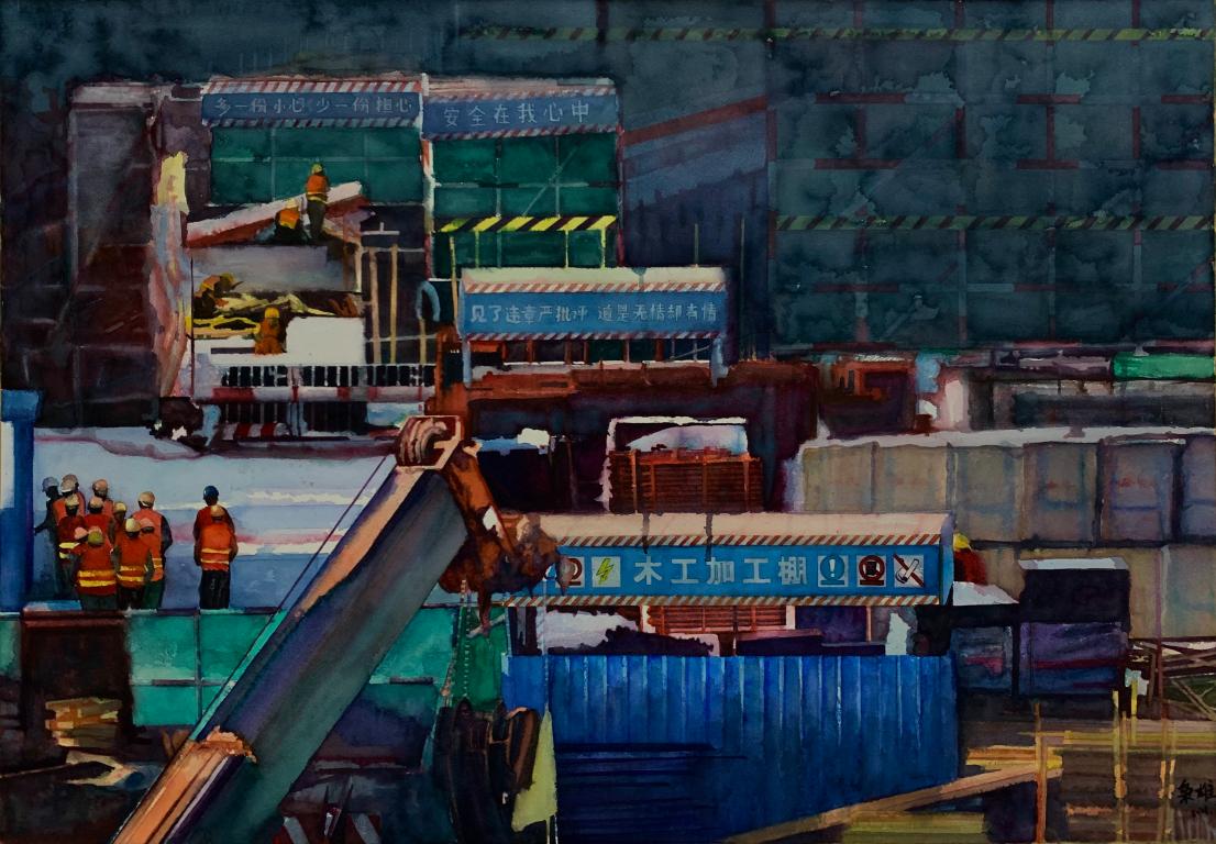 作品解析:此画的内容是以父亲的真实生活和工作为题材,画面主要以建设机器,工人,建筑房和大场景为主要构成,其大背景也是通过整体性处理以及局部性水迹相交融合,整幅画面不仅是当今社会基层建工的真实场景,也是一个当今时代飞速发展的缩影。