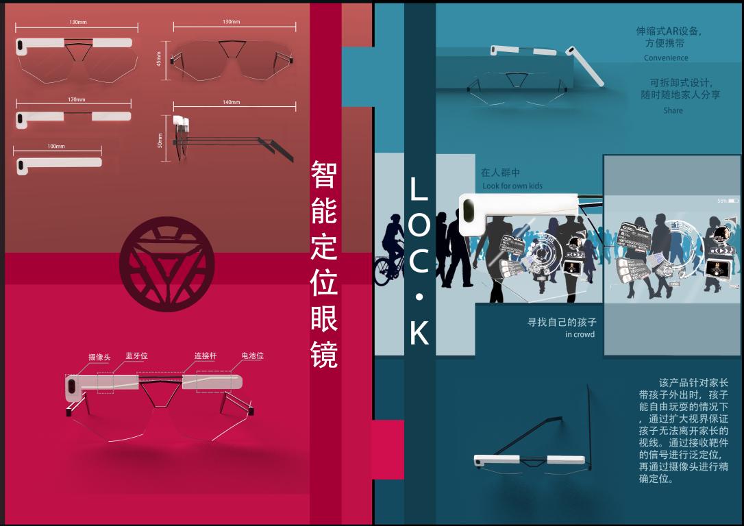 作品解析:本作品根据温州智造的理念,以AR眼镜为基础,灵感来自于钢铁侠对于小蜘蛛无微不至的关照,当小蜘蛛身处危险时,无论在何处钢铁侠都能精准定位,将这一设定应用于家长带孩子外出时,通过扩大家长视界的方式使孩子无法离开家长的视线,同时增加了孩子玩耍的自由度。