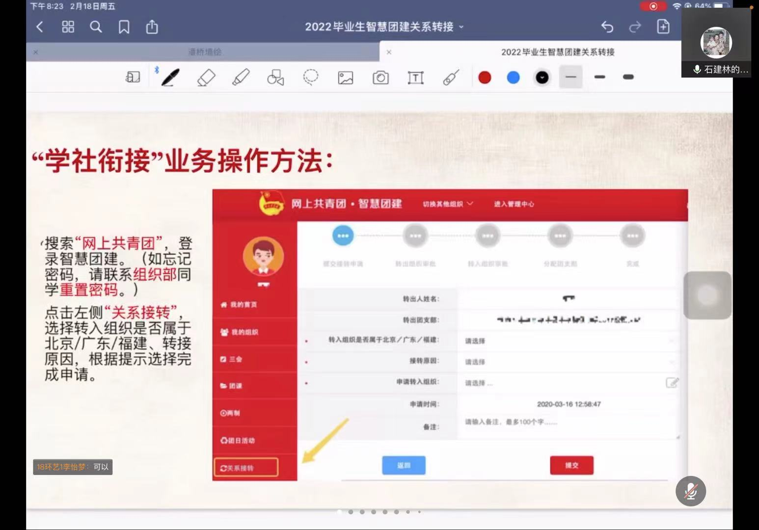 公司团学指导老师、辅导员石建林发表讲话,对“智慧团建”系统中关于团员团组织关系的转接问题给毕业生团员进行了详细阐述,并提醒每位校内校外的毕业生在当前严峻的疫情形势下,遵守公司相关的防疫规定。