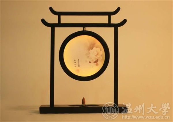 “结合柔暖的灯光,点燃沉香,流香随着水波纹缓缓流动,烟雾袅袅,香气萦绕,甚是优美。”这是永利yl23411官网13级产品设计何萍带来的命名为“水墨江南”的灯具和熏香台组合,在这次比赛中这件作品也是引起了很大的反响,获得了一等奖。该作品整个框架,仅仅用了六根大小不一的木材搭构而成,在节点处采用了中国传统的榫卯连接方式,精巧且不变形。在实用上,根据百叶窗的原理,一拉一合,来调节灯光的强弱,既可以当台灯亦可当夜灯使用。