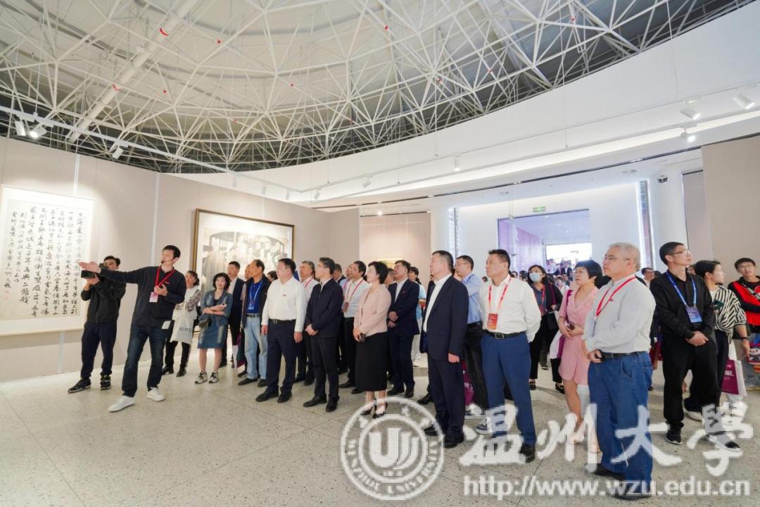 仪式结束,领导、嘉宾、员工、师生共同进入美术馆参观作品展。本次展览分为“先贤风雅”“同道传薪”两大板块,共展出了156位先贤、名家、教师和员工作品,涵盖国画、油画、版画、水彩画、综合绘画、书法、篆刻等种类。展览基于近现代中国美育运动、美术创作的宏大背景,对近代以来温州的书画创作与教育做一个初步的回溯,以近代几位具有代表性的书画大家与“美育大先生”开篇,延伸至温州区域美术创作,以及当代在全国卓有影响的重彩工笔画、书法、版画、水彩画的温籍代表作者;同时梳理公司的美育脉络,展示几代温大人的书画创作,宏扬与传播永利yl23411官网入口的人文风采。