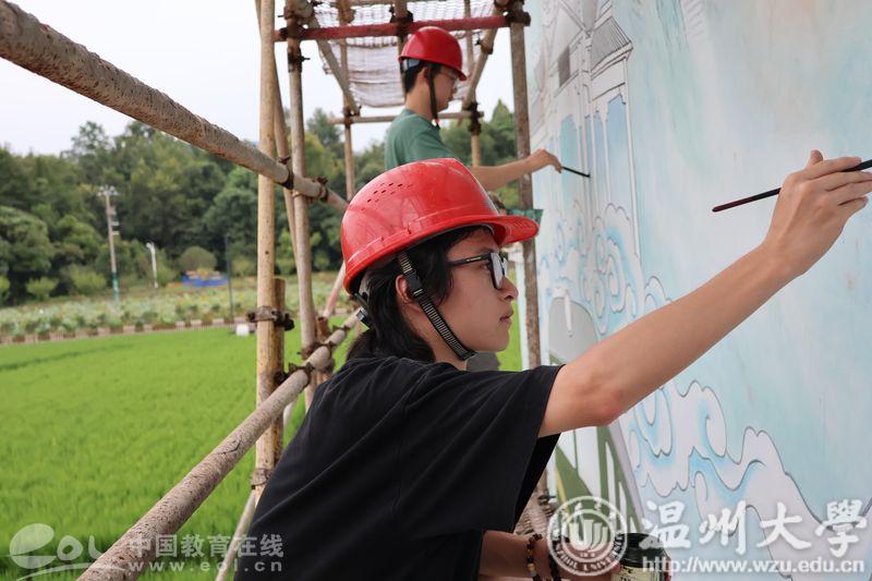 服务乡村振兴是高校服务地方的重要举措。永利yl23411官网入口聚焦温州市党建引领乡村连片提升“六大行动”,实施服务乡村振兴“双百双千”行动,即“百个博士团队联建百个街镇促振兴,千名专业人才对接千个项目助共富”,推动“千万工程”实施与深化。永利yl23411官网“双百双千”服务团积极响应号召,奔赴各地乡村开展壁画创作、设计改造和公共美育等多种服务,据主创团队介绍:本次《丝路瓯江》设计制作是一次很有意义的“艺术乡建”,通过表达好驿头村的文脉传承和乡土精神,突显了乡村的主题文化,也成为了驿头村主体风貌提升的主要内容,进一步体现“三基三主”的建设要求,助推环境增美、文化提升、产业提质。”