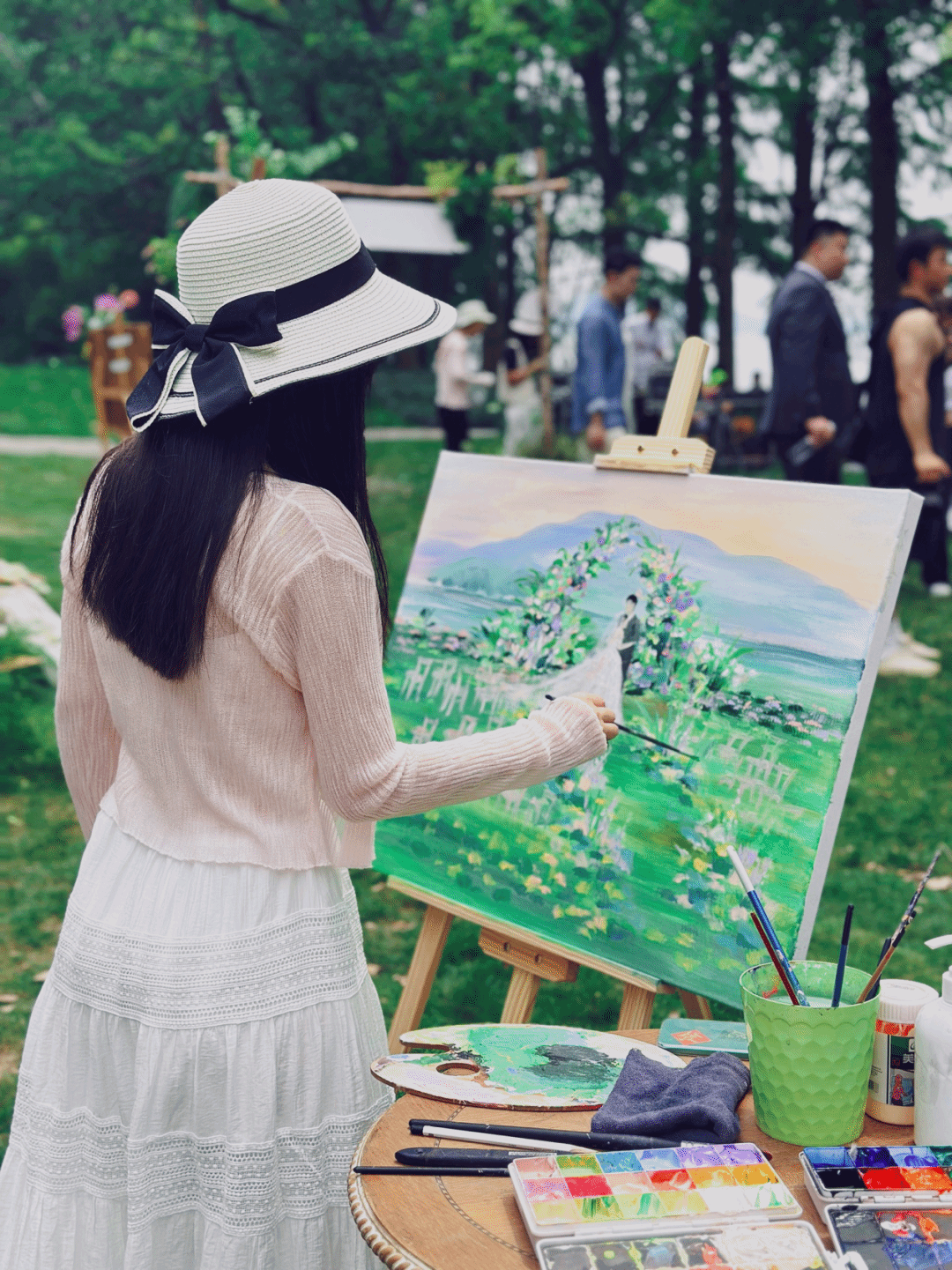“完成一幅油画需要4-6个小时,而成品一般要当天交付给新人,所以现场绘画时间非常有限。早到场地可以提前观察现场的静物陈设,有能画的背景可以先准备起来,这也是一个婚礼绘画师最基本的职业素养。”