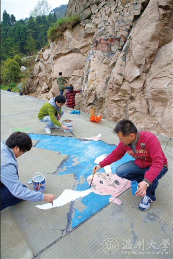 温州网讯 近日,在温州市区大罗山盘垟村入口处,十多名温大美术公司的师生,在水泥路、岩石上进行手绘创作——蓝色的天空、憨态的智慧猪,生动有趣。news.66wz.com/system/2015/04/20/104422135.shtml