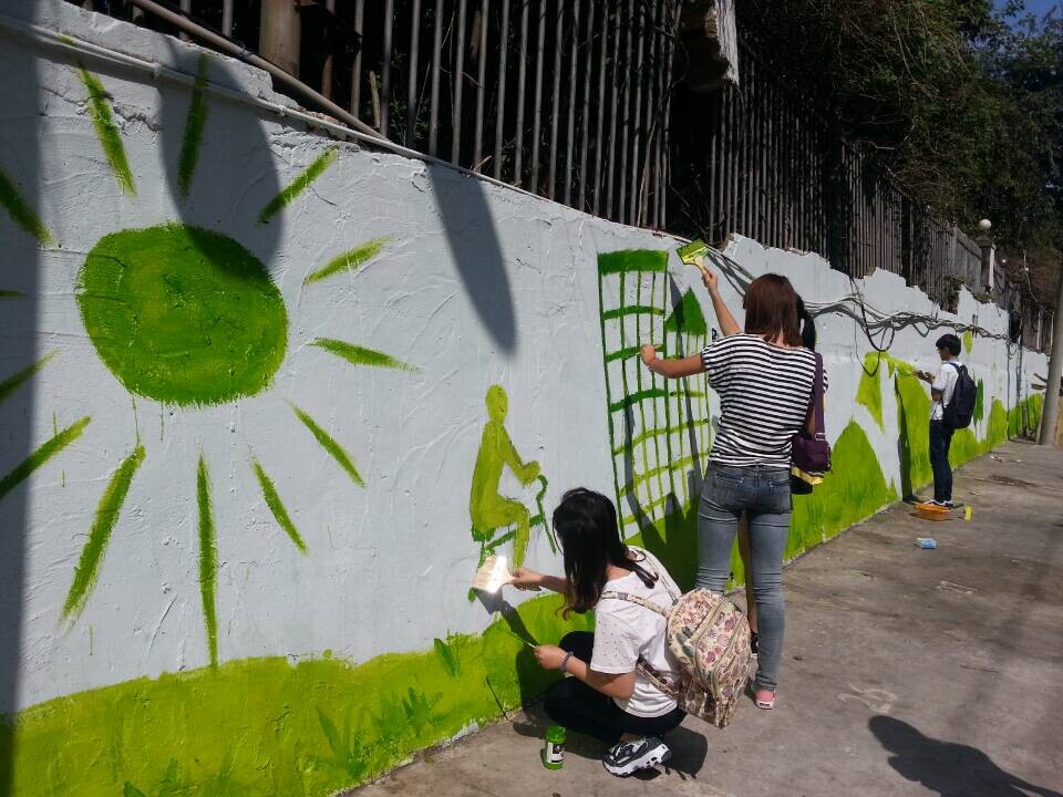 受茶山街道梅泉社区居委会的邀请,永利yl23411官网的“艺家人”青年志愿者协会的志愿者们一起参与了该社区“创建文明城市”的墙绘活动。昨日上午8点,老员工们开始在白色空旷的墙壁的作画,以绿色作为主色调,宣传低碳环保的生活理念。100多米的小吃巷外墙被美丽的手绘画所代替,吸引了不少居民驻足观看。
