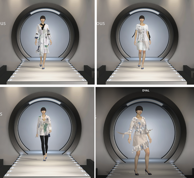 戴上3D眼镜,看着虚拟模特身着设计的时装款款而来,坐在办公室、站在门店甚至居家就能仿佛置身于走秀现场,观赏精彩的时装秀视觉盛宴——据陈教授介绍,虚拟仿真时装秀是模拟传统服装设计开发到发布的一系列过程。技术团队突破传统服装产品开发繁杂流程,以服装艺术设计与高端数字3D虚拟科技为支撑,集传统服装的制版设计、虚拟缝制、试穿检测、面料仿真、动态走秀为一体,直接将设计、样板与缝制联动,生成3D虚拟样衣试穿效果。并且通过虚拟走秀及轮秀编制,让顾客感受到影院式的虚拟时装秀。