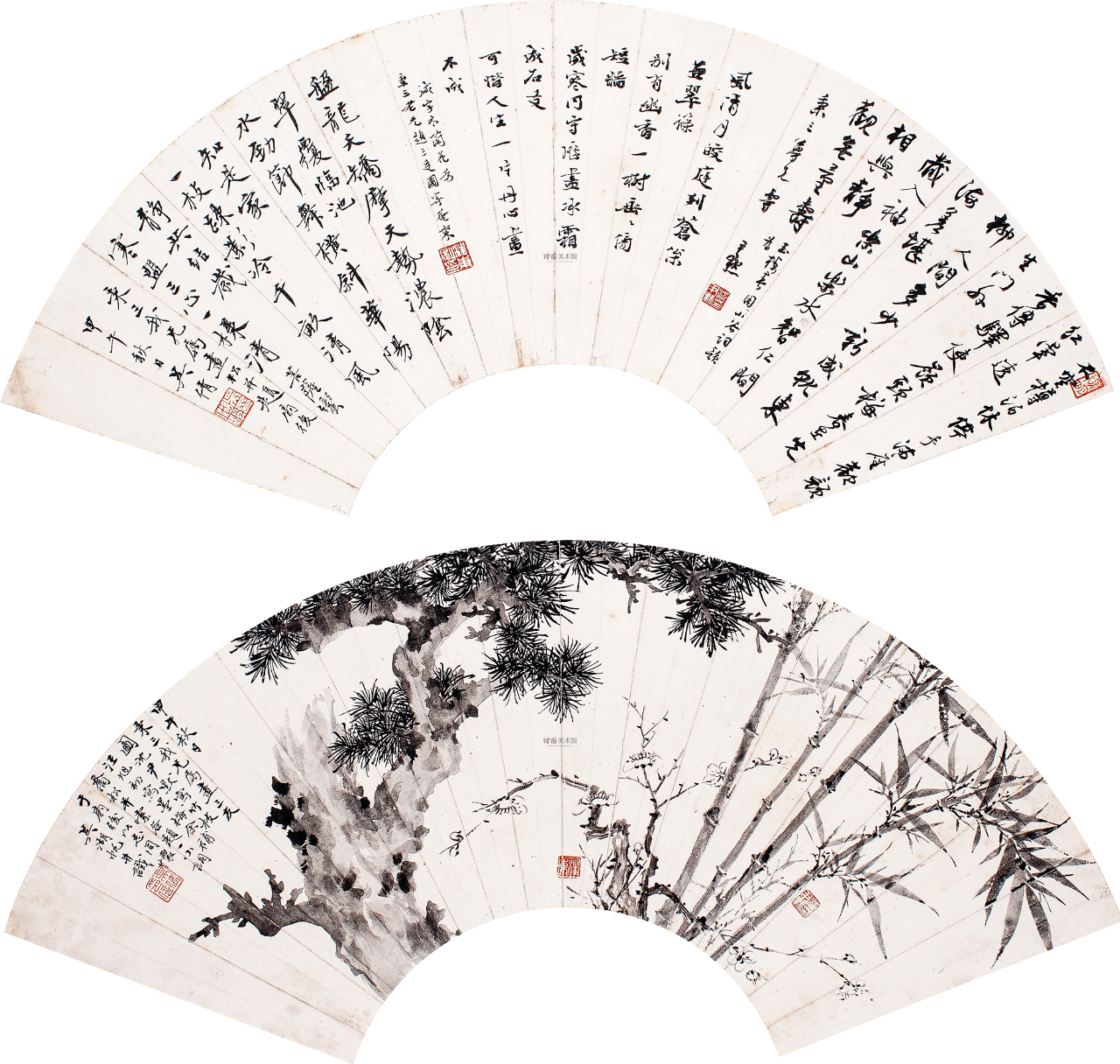 明清时期,摺扇替代纨扇成为扇面书画的主流。摺扇源出日本与高丽,大约在北宋传入中国,得到普遍青睐却已是明朝之后的事情。摺扇可徐徐展开又方便收纳,实用与审美兼得,颇得文人雅士喜爱。明清时吴门四家、扬州八怪、四王四僧传世之作,多见扇面形制,尽管不如大幅卷轴、手卷气势恢宏,却往往更得怡情悦性之趣,常见神来之笔。