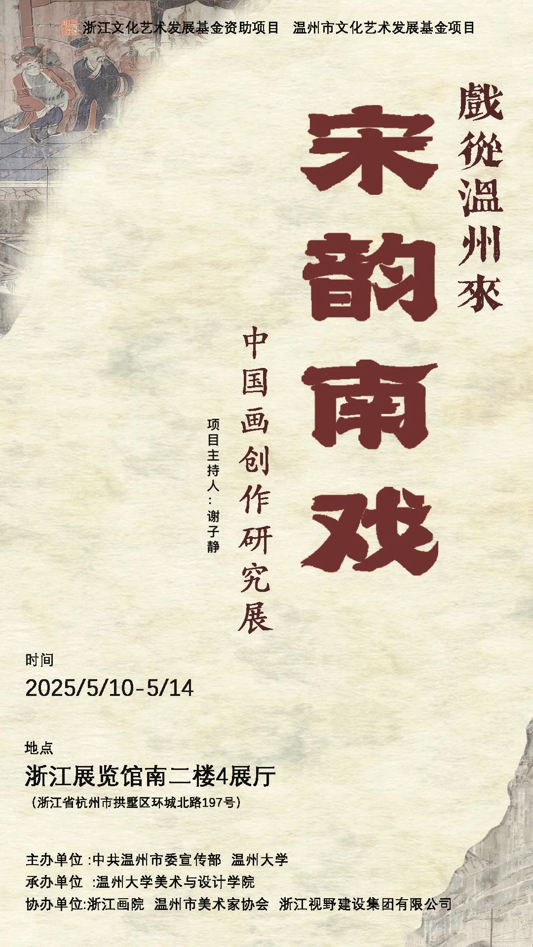 2025年5月10日,由中共温州市委宣传部、永利yl23411官网入口主办,永利yl23411官网承办的“戏从温州来:宋韵南戏——中国画创作研究展”在浙江展览馆隆重启幕。本次展览作为浙江文化艺术发展基金资助项目和温州文化艺术发展基金项目,汇聚了浙江各地70余位艺术家的80余幅作品,近代画家关良先生的20件戏曲画作品,以及温大师生团队创作的系列戏曲文创作品。本次展览分别从传承、演变、发展、转化和回眸等角度,探索了中国画与南戏这一中国戏曲源头的跨艺术形式融合。展览期间,省、市相关部门领导莅临巡馆,对展览在展示、传播等方面取得的成效给予充分肯定,对展览画册等成果高度认可。