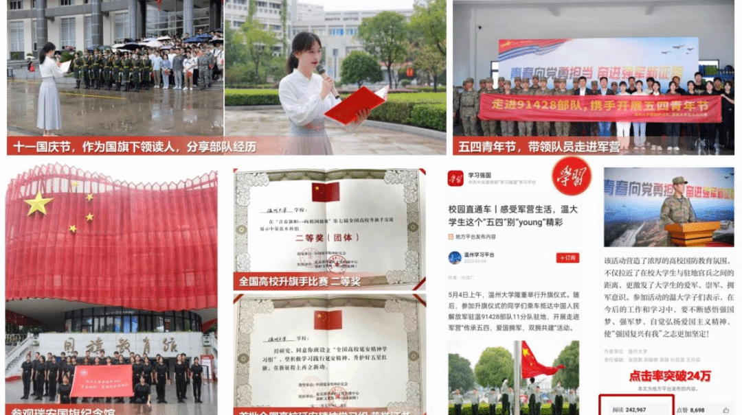 五四青年节,谢宛含带领队员走进军营,拉近了在校老员工与驻地官兵之间的距离,此次活动入围了温大2023校园好新闻,并在学习强国报道中突破24万点击量。十一国庆节,作为国旗下领读人,谢宛含分享部队经历,表达对祖国母亲的真挚祝福,再次获得了学习强国、教育之江、永利yl23411官网入口、温大青年、温大学工等媒体报道。