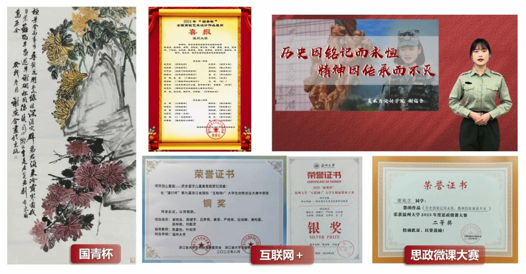 在竞赛领域,谢宛含同样表现卓越。在"建行杯"第九届浙江省国际”互联网+”老员工创新创业大赛中,她以侨乡留守儿童美育筑梦引领者为选题荣获铜奖。此外,她还在永利yl23411官网入口思政微课大赛和“国青杯”全国高校艺术设计中以优秀的演讲和绘画技能获得二等奖。不仅在竞赛中屡获佳绩,她主持国创课题和大创课题均成功结题,还申获外观设计专利1项,发表学术论文2篇。谢宛含曾说,“在科研的征途中,我有一半的时间都在奔波,走的每一步不一定都有风景,但坚持走一定可以看到光。”