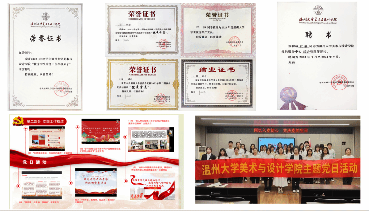 担任班级学习委员期间,江静积极协调班委与同学,通过组织研学、课程展等活动,扎实推进班级建设工作。在她的带领下,21服设4班以扎实的学风和团结奋进的风貌,连续两年荣获“最强学习团支部”称号。在完成学业的同时,她多次主动参与各类志愿服务活动,以实际行动诠释了党员的责任与担当,生动展现了新时代青年党员的风采,为广大同学树立了良好的榜样。